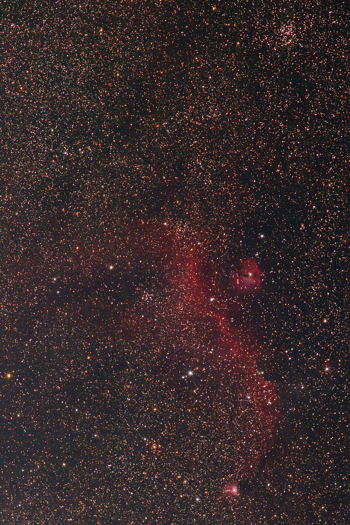 ・105mm(シグマ、105mm F2.8 MACRO) 右上の散開星団がM50、やや右の大きな赤い散光星雲がIC2177、左下の 角にあるのがNGC2359です。他にも多数の散開星団や散光星雲が写って います。 データ:露出5分×3、EOSKissDigitalX(IRカットフィルタ除去)+LPS-P2、1/2倍 ・200mm(キヤノン、EF200mm F2.8L II USM) 200mmとEOSKissDX4を使えば、1/2縮小でも大きく写ります。 データ:露出30秒×32、EOSKissDX4(スターショップ新改造)、1/2縮小 ・300mm(シグマ、APO TELE MACRO 300mm F4) いっかくじゅう座とおおいぬ座の境界にある美しい散光星雲です。 鳥が羽ばたいている様な形なので、日本ではわし星雲、欧米ではかもめ星雲と呼んで います。 データ:露出8分×6、EOSKissDigitalX(IRカットフィルタ除去)+HEUIBフィルタ、1/2縮小 ・500mm(ペンタックス、75SDHF) ややピントが甘かったために、星が大きくなってしまいました。もっと沢山、コンポジット しないとノイズが消えませんね。 データ:露出8分×6、EOSKissDigital(IRカットフィルタ除去)+HEUIBフィルタ、1/2縮小 ・830mm(セレストロンC8-N+クローズアップレンズAC No.4) 輝度データはQBPフィルタを用いたASI294MM、色データは初代EOSKissDのものを使用し、 YIMGでL+RGBで合成しました。QBPフィルタを使うと星雲がはっきり写ります。 大きいので、ASI294MMを使っても一部しか写りません。 輝度データ:露出16秒×32(QBPフィルタ)、ASI294MM、1/2縮小 色データ:SE150 露出8分×3、EOSKissDigital(IRカットフィルタ除去)+HEUIB-IIフィルタ