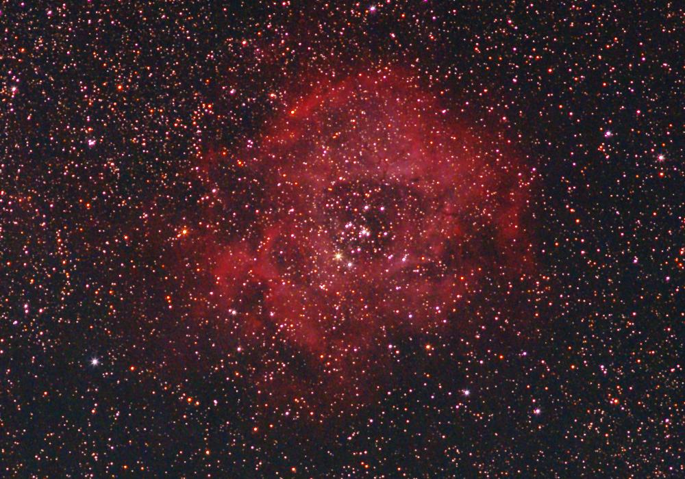 ・105mm(シグマ、105mm F2.8 MACRO) 赤いバラの花のような形で、非常に有名で人気のある天体です。上方には、NGC2264や淡い星雲が 見えています。 データ:露出3分×3、EOSKissDigital(IRカットフィルタ除去)+HEUIBフィルタ、1/2縮小 ・200mm(キヤノン、EF200mm F2.8L II USM) データ:露出30秒×64、EOSKissDX4(スターショップ新改造)、1/2縮小 ・300mm(シグマ、APO TELE MACRO 300mm F4) 4等星しか見えない自宅からの撮影ですが、よく写りました。 LPS-P2のせいか、赤以外の色彩が乏しいように見えます。下の、500mmや616mm と比べると、青い星の色が出ていません。 データ:露出8分×3、EOSKissDigitalX(IRカットフィルタ除去)+LPS-P2フィルタ、1/2縮小 ・500mm(ペンタックス、75SDHF) この焦点距離では、淡い部分も含め、丁度納まります。バラの中心にある散開星団NGC2244も、屈折望遠鏡 で撮影したので、明るく、色もはっきり写り、非常に美しいです。 データ:露出8分×6、EOSKissDigital(IRカットフィルタ除去)+HEUIBフィルタ、1/2縮小 ・616mm(ケンコー、SE150N+AC No.4) ちょっと画面からはみ出します。 コンポジット枚数を増やしましたが、上の75SDHFの方が星雲がきれいです。 データ:露出5分×6、EOSKissDigital(IRカットフィルタ除去)+HEUIBフィルタ、1/2縮小 露出5分×3、EOSKissDigital(IRカットフィルタ除去)+UIBAR-IIIフィルタ ・750mm(ケンコー、SE150N+ビクセン コマコレクター2) 星雲が画面からはみ出しています。しかし、解像度は高く、グロビュールと呼ばれる 小さな暗黒星雲の粒が良く分かります。7コマをコンポジットし、ウェーブレットをかけています。 データ:露出8分×7、EOSKissDigital(IRカットフィルタ除去)+HEUIBフィルタ、4コマ、1/2縮小 EOSKissDigital(IRカットフィルタ除去)+UIBAR-IIIフィルタ、3コマ ・830mm(セレストロンC8-N+クローズアップレンズAC No.4) 輝度データはQBPフィルタを用いたASI294MM、色データは初代EOSKissDのものを使用し、 YIMGでL+RGBで合成しました。 QBPフィルタにより星雲がはっきりしました。ASI294MMではこれだけの範囲が写ります。 輝度データ:露出16秒×32(QBPフィルタ)、ASI294MM、1/2縮小 色データ:SE150N EOSKissDigital(IRカットフィルタ除去)+HEUIB-IIフィルタ |